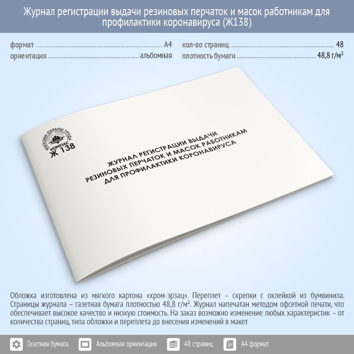 Журнал регистрации выдачи резиновых перчаток и масок работникам для профилактики коронавируса (48 стр., Ж138) в Фрязино купить