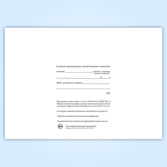 Вы получаете печатную продукцию прошнурованной и c местом для вашей печати в соответствии с действующими нормативными документами: