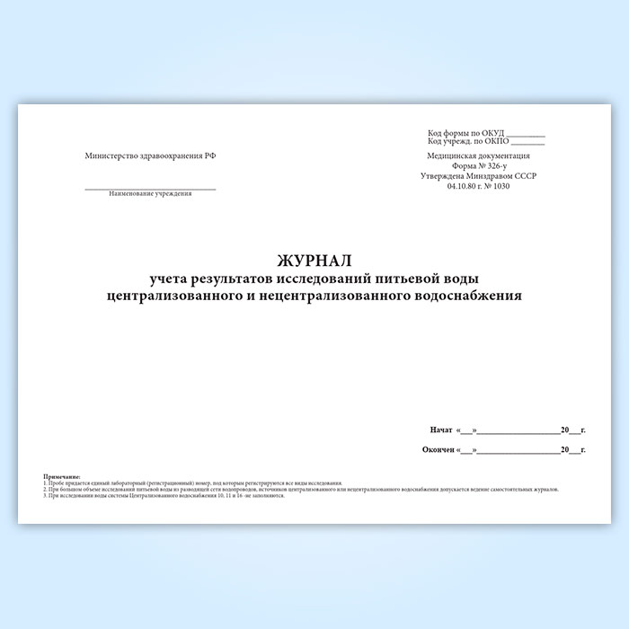 Журнал учета результатов исследований питьевой воды централизованного и нецентрализованного водоснабжения (форма 326-у) в Фрязино купить