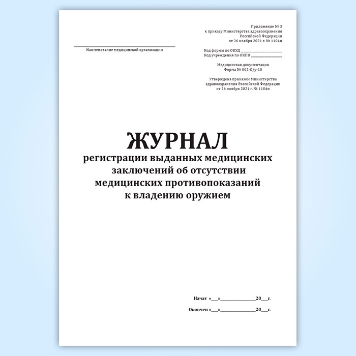 Журнал регистрации выданных медицинских заключений об отсутствии медицинских противопоказаний к владению оружием (форма 002-О/У-10) в Фрязино купить