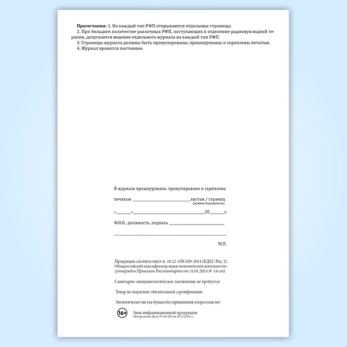 Приходно-расходный журнал учета радиофармпрепаратов, поступающих в подразделение радионуклидной терапии в готовом виде для непосредственного введения в организм пациента в Фрязино купить
