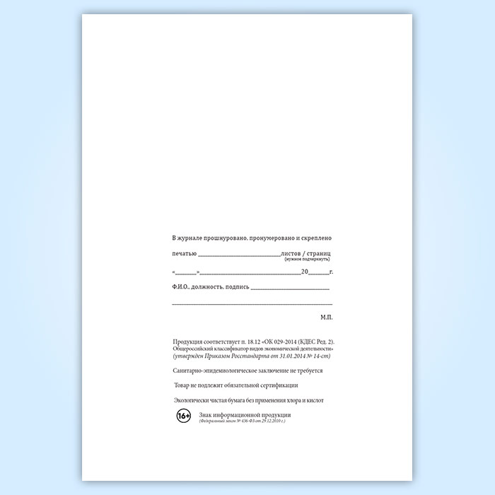 Вы получаете печатную продукцию прошнурованной и c местом для вашей печати в соответствии с действующими нормативными документами: