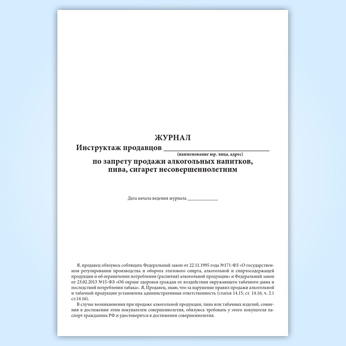Журнал инструктажа продавцов по запрету продажи алкогольных напитков, пива, сигарет несовершеннолетним в Фрязино купить