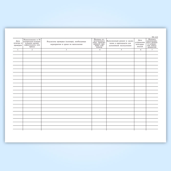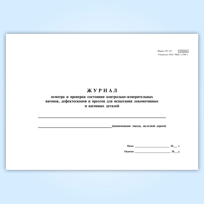 Журнал осмотра и проверки состояния контрольно-измерительных вагонов, дефектоскопов и прессов для испытания локомотивных и вагонных деталей (форма ТУ-113) в Фрязино купить