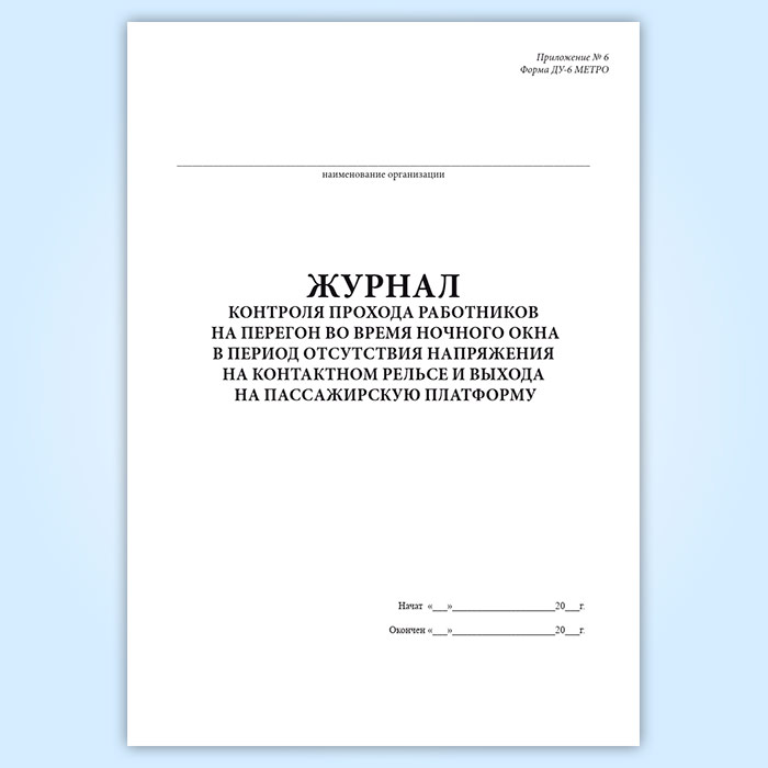 Журнал контроля прохода работников на перегон во время ночного окна в период отсутствия напряжения на контактном рельсе и выхода на пассажирскую платформу (форма ДУ-6 МЕТРО) в Фрязино купить