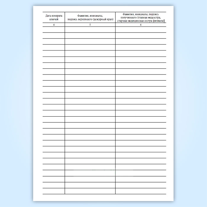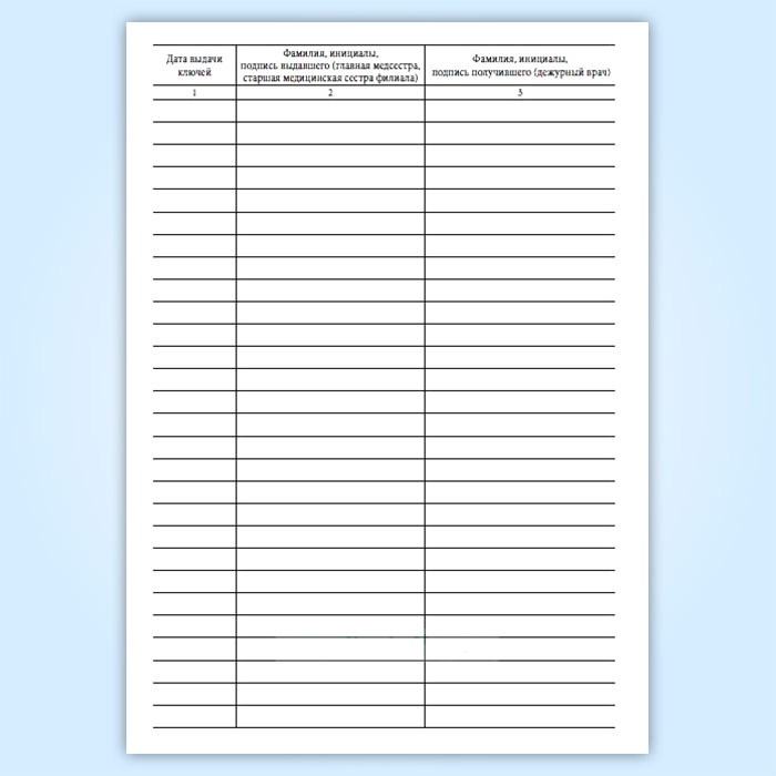 Журнал передачи ключей главной медсестры (старшей медицинской сестры филиала) дежурным врачам от помещения и сейфа, где проводятся операции, связанные с оборотом наркотических средств и психотропных веществ, в выходные и праздничные дни в амбулаторном отделении медицинской организации в Фрязино купить