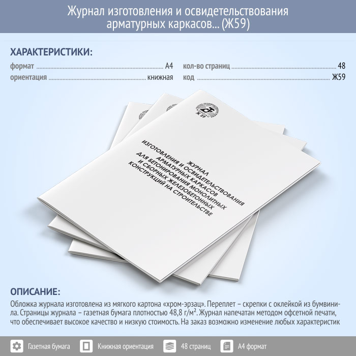 Журнал изготовления и освидетельствования арматурных каркасов для бетонирования монолитных и сборных железобетонных конструкций на строительстве (Ф-48) (48 стр., Ж59) в Фрязино купить