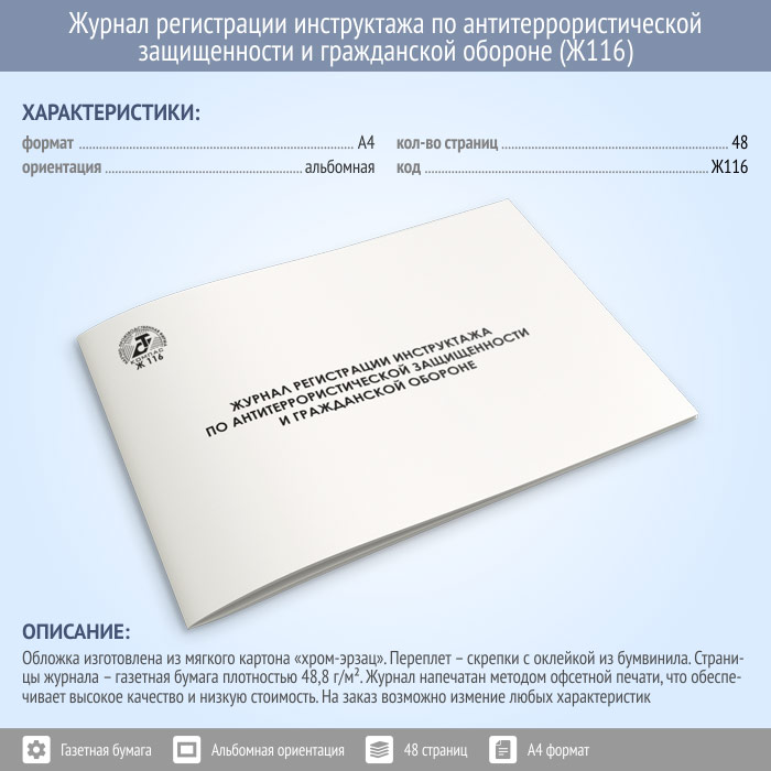 Журнал регистрации инструктажа по антитеррористической защищенности и гражданской обороне (48 стр., Ж116) в Фрязино купить