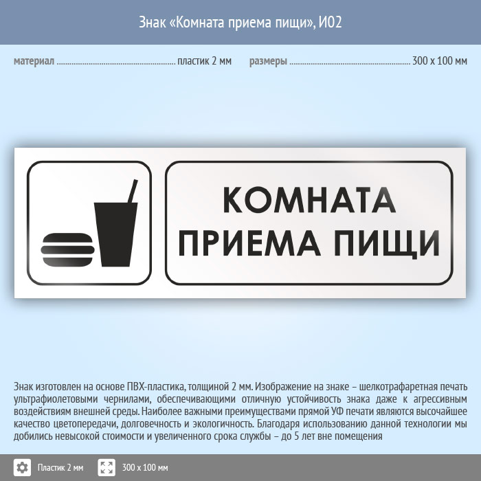 Знак «Комната приема пищи», И02 (пластик, 300х100 мм) в Фрязино купить