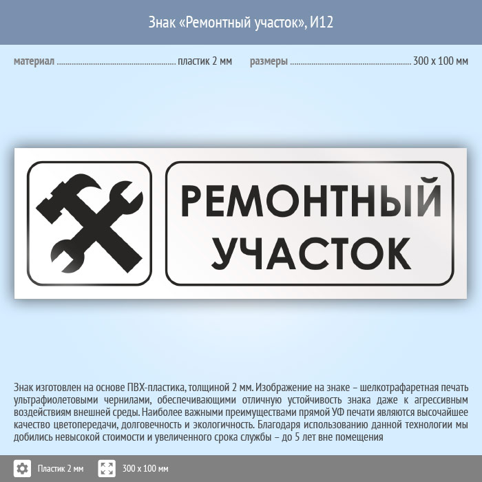 Знак «Ремонтный участок», И12 (пластик, 300х100 мм) в Фрязино купить