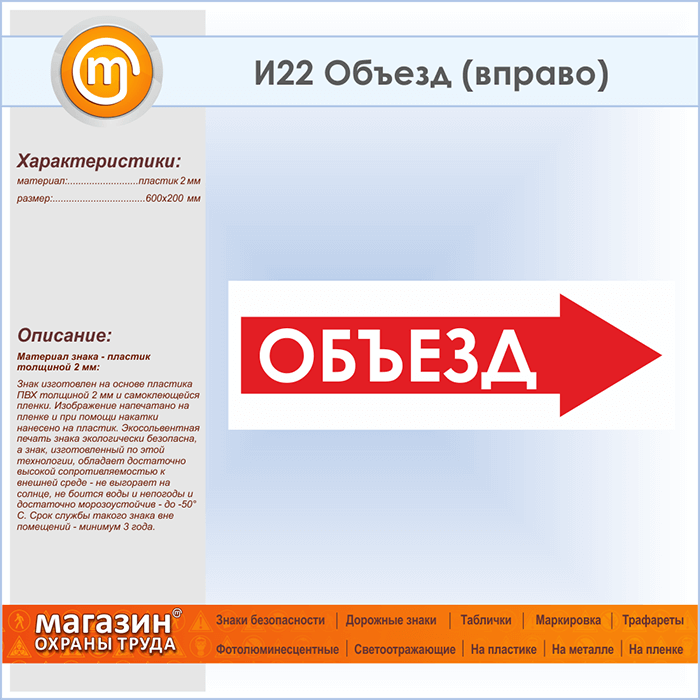 Знак «Объезд (вправо)», И22 (пластик, 600х200 мм) в Фрязино купить