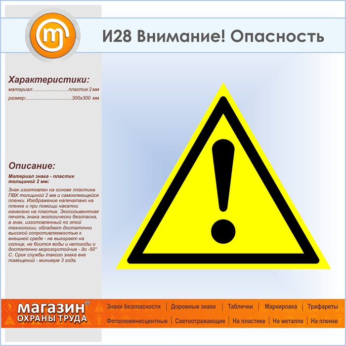Знак «Внимание! Опасность», И28 (пластик, сторона 300 мм) в Фрязино купить