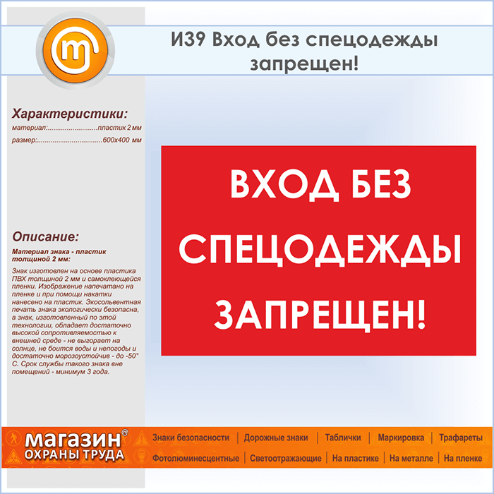 Знак «Вход без спецодежды запрещен!», И39 (пластик, 600х400 мм) в Фрязино купить