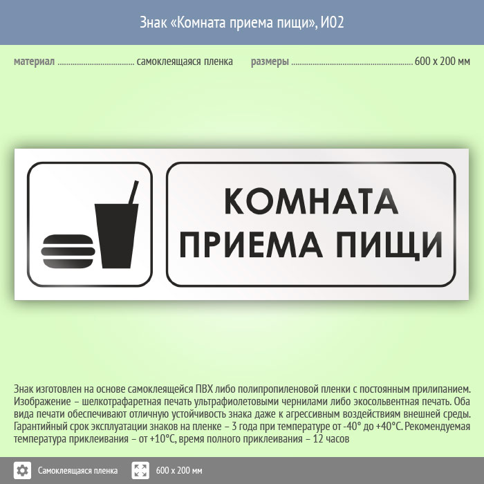 Знак «Комната приема пищи», И02 (пленка, 600х200 мм) в Фрязино купить
