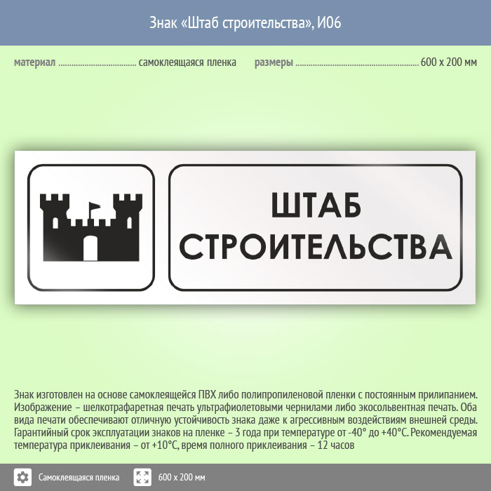 Знак «Штаб строительства», И06 (пленка, 600х200 мм) в Фрязино купить