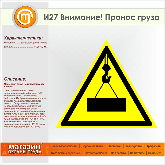 Знак «Внимание! Пронос груза», И27 (пленка, сторона 500 мм) в Фрязино купить