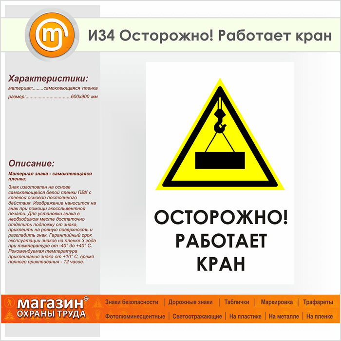 Знак «Осторожно! Работает кран», И34 (пленка, 600х900 мм) в Фрязино купить