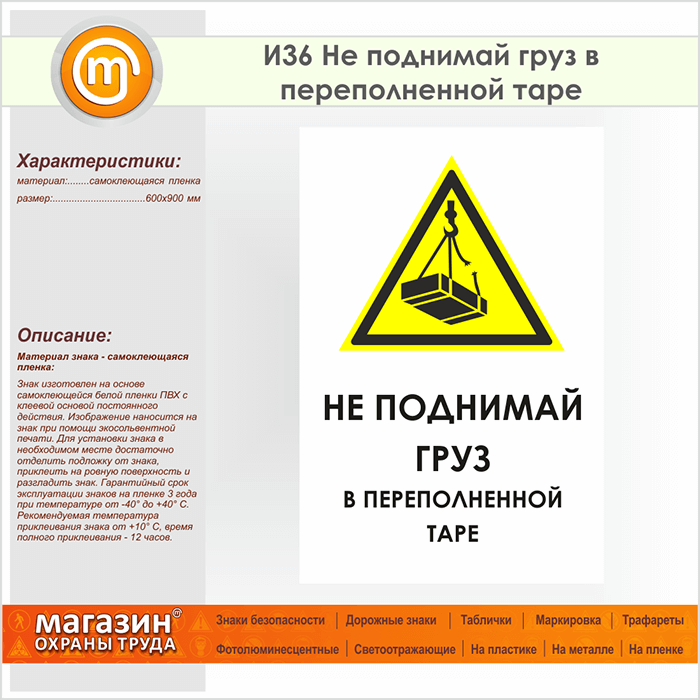 Знак «Не поднимай груз в переполненной таре», И36 (пленка, 600х900 мм) в Фрязино купить