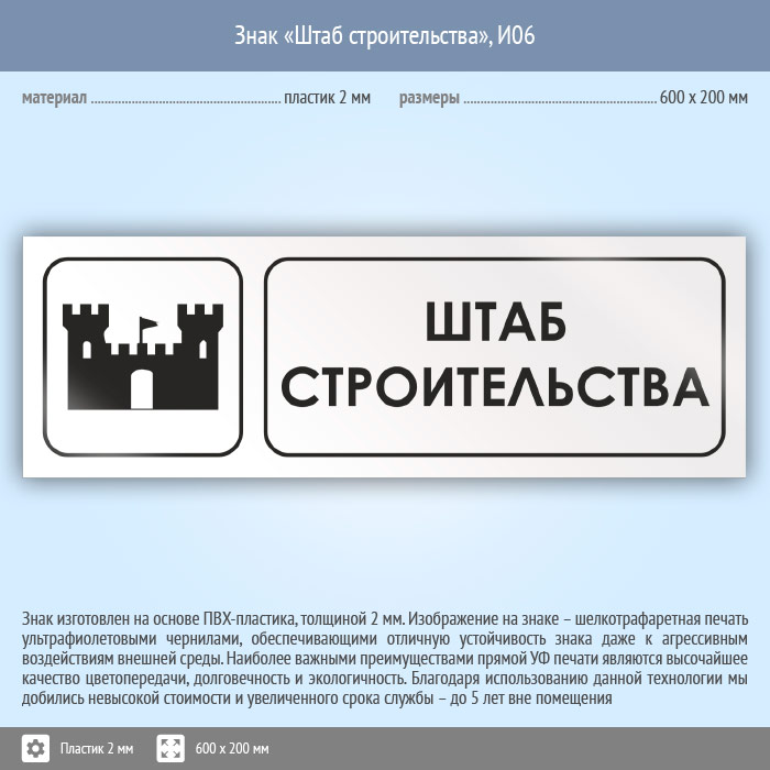 Знак «Штаб строительства», И06 (пластик, 600х200 мм) в Фрязино купить