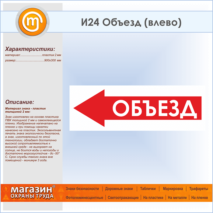 Знак «Объезд (влево)», И24 (пластик, 900х300 мм) в Фрязино купить