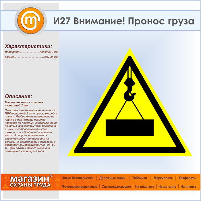 Знак «Внимание! Пронос груза», И27 (пластик, сторона 700 мм) в Фрязино купить