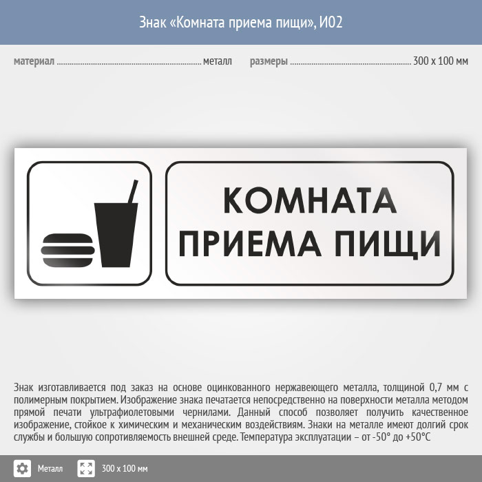 Знак «Комната приема пищи», И02 (металл, 300х100 мм) в Фрязино купить