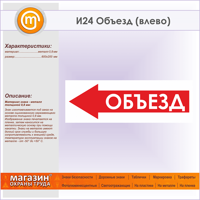 Знак «Объезд (влево)», И24 (металл, 600х200 мм) в Фрязино купить