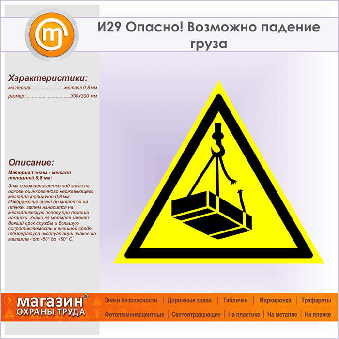 Знак «Опасно! Возможно падение груза», И29 (металл, сторона 300 мм) в Фрязино купить