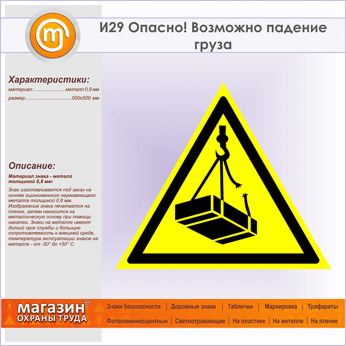 Знак «Опасно! Возможно падение груза», И29 (металл, сторона 500 мм) в Фрязино купить