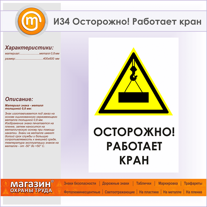 Знак «Осторожно! Работает кран», И34 (металл, 400х600 мм) в Фрязино купить